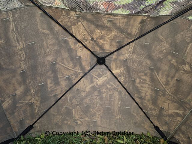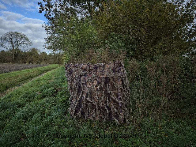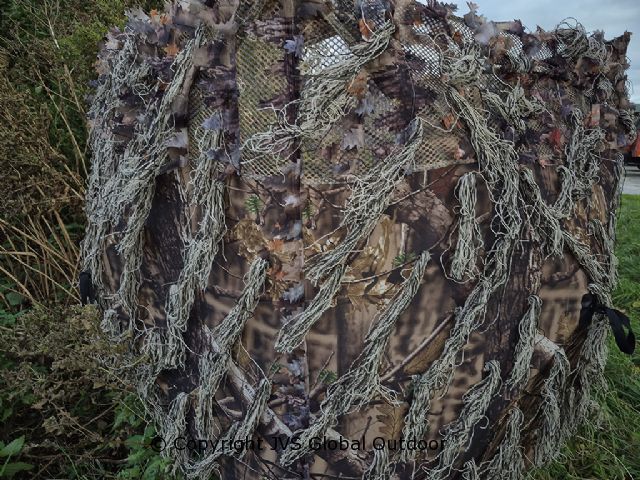 The camouflage pattern consists of dark brown leaf motifs that blend seamlessly into a dark background, complemented by ghillie strips for extra coverage. With a lightweight design of only 3 kg, this tent is easy to carry. Supplied with a convenient storage bag.