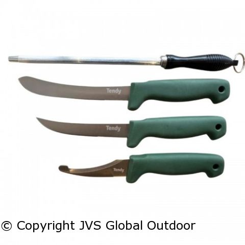 The Tendy knife butchering set is a complete and practical kit for processing and dressing game. With three specially designed knives, you have the right tool for every step of the butchering and field dressing process. From precise gutting and working along bones and joints to safely opening the abdomen, this set is designed for control, precision, and ease of use.
