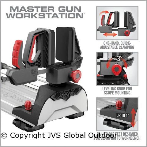 For mounting optical equipment, the Master Gun Workstation offers a unique Leveling Knob. This one-handed leveling feature allows for easy adjustments with micro-adjustments up to ±3°, ensuring your scope is perfectly aligned.